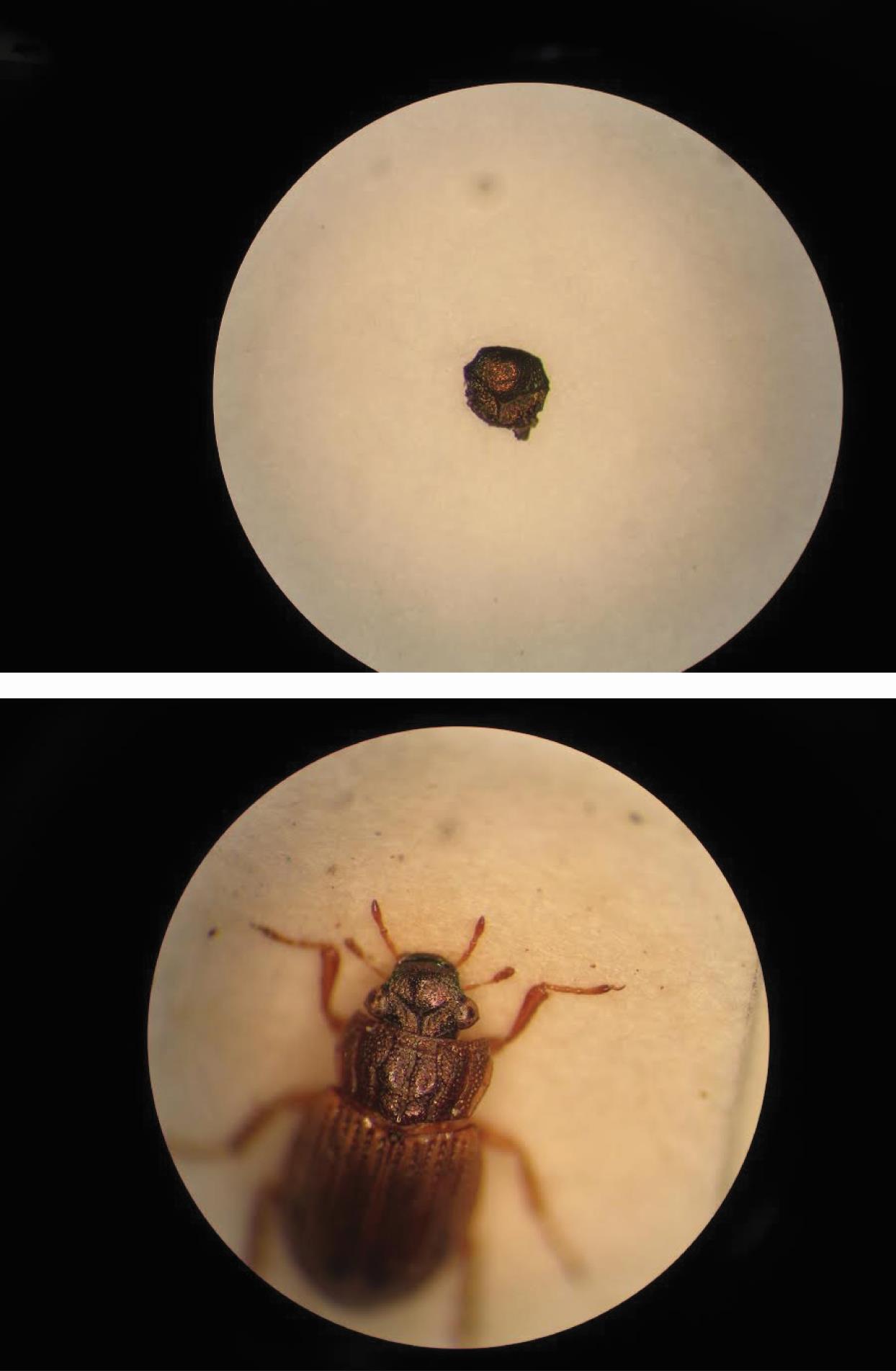 A fossil clypeus (head plate), 1mm long and over 600,000 years old, of Helophorus strigifrons (above), and a complete modern specimen of H. strigifrons from the collections at Plymouth City Museum and Art Gallery (Images by the author)