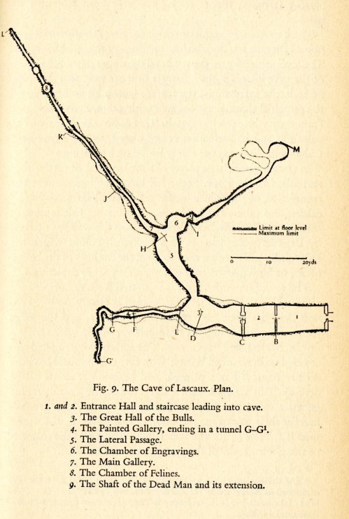 The layout of the Lauscaux cave, showing where teh different chambers are. (From Laming 1959, page 61)