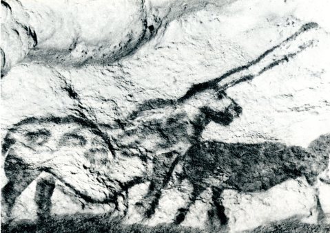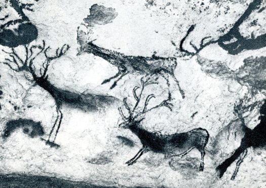 Deer running on the walls in the Great Hall of Bulls. Each individual deer is about 2 feet long. (From Laming 1959, Plate 4)